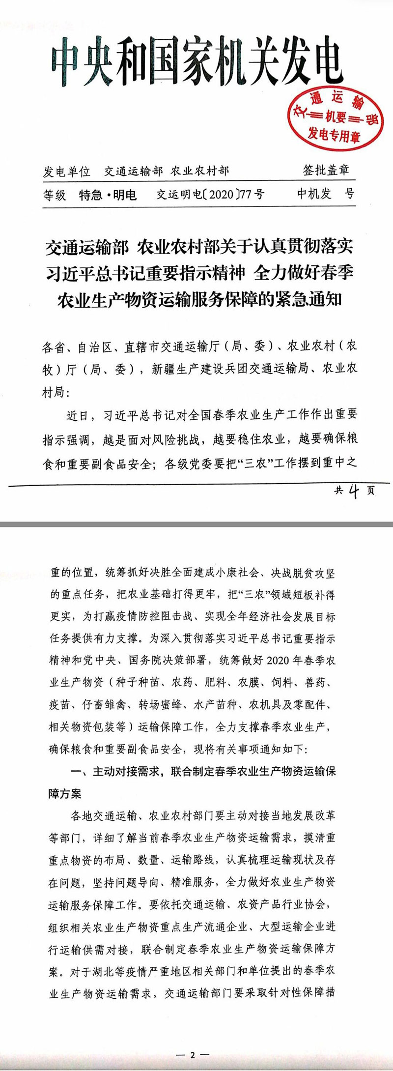 2月26日,交通運輸部、農(nóng)業(yè)農(nóng)村部聯(lián)合印發(fā)緊急通知,要求各地交通運輸、農(nóng)業(yè)農(nóng)村部門認真貫徹落實習(xí)近平總書記關(guān)于全國春季農(nóng)業(yè)生產(chǎn)工作的重要指示精神,按照黨中央、國務(wù)院決策部署,統(tǒng)籌做好2020年春季農(nóng)業(yè)生產(chǎn)物資(種子種苗、農(nóng)藥、肥料、農(nóng)膜、飼料、獸藥、疫苗、仔畜雛禽、轉(zhuǎn)場蜜蜂、水產(chǎn)苗種、農(nóng)機具及零配件、相關(guān)物資包裝等)運輸保障工作,全力支撐春季農(nóng)業(yè)生產(chǎn),確保糧食和重要副食品安全。